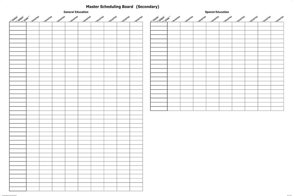 This scheduling board for secondary campuses (40” x 60”) provides campuses with a structured visual format to manually schedule students with special needs into the campus master schedule. The use of sticky notes to identify class sections ensures the board can be reused from year to year.