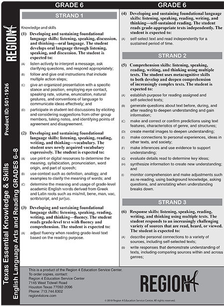 A three-fold chart with the complete TEKS for English Language Arts and Reading for Grade 6 through Grade 8. This convenient resource can be inserted into a 3-ring binder. Sold in sets of 10.